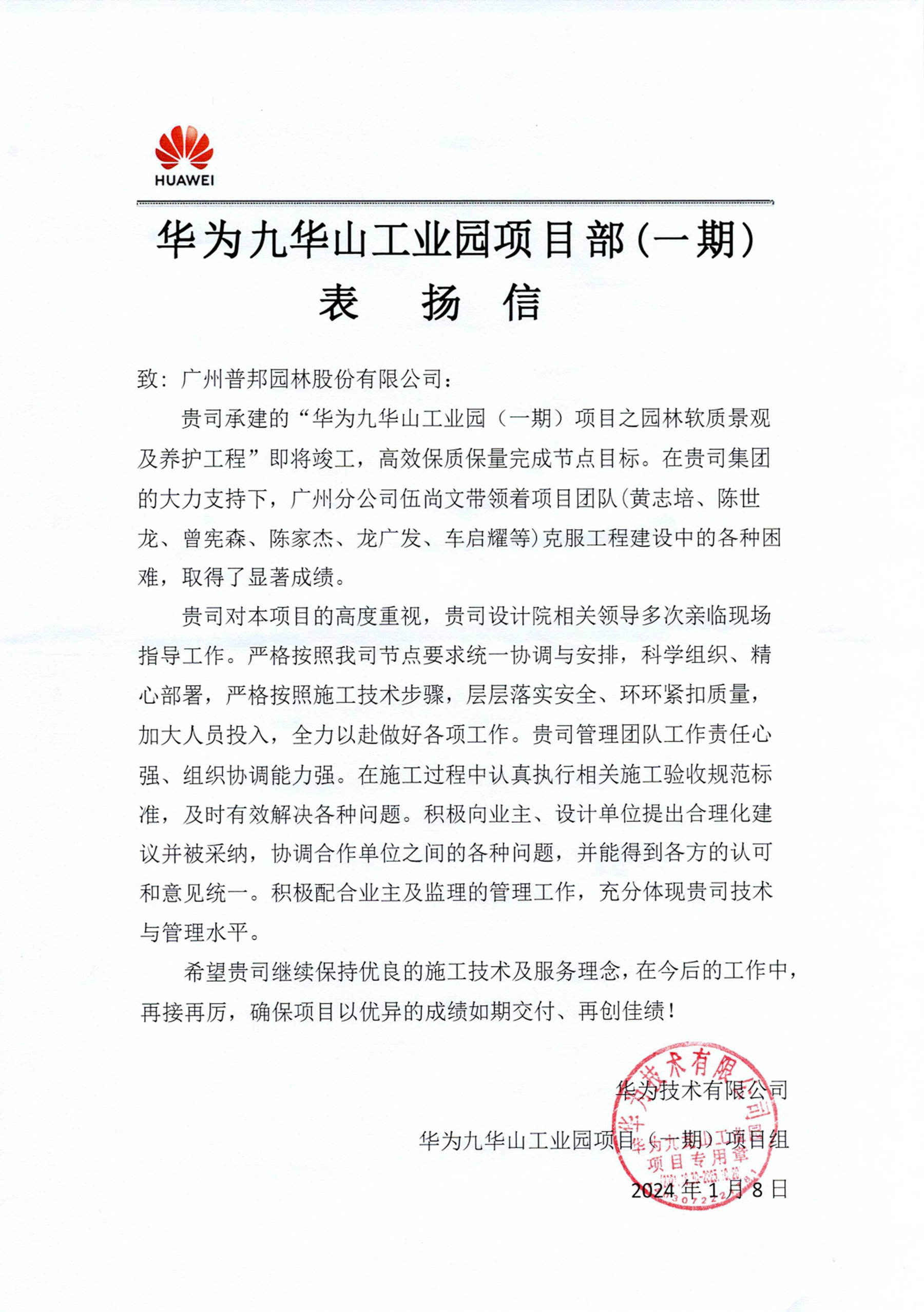 近日,華為技術(shù)有限公司華為九華山工業(yè)園項目(一期)項目組向我司發(fā)出表揚(yáng)信。信中高度贊揚(yáng)我司在“華為九華山工業(yè)園(一期)項目之園林軟質(zhì)景觀及養(yǎng)護(hù)工程”實(shí)施過程中體現(xiàn)出的優(yōu)良施工技術(shù)與高效履約精神。