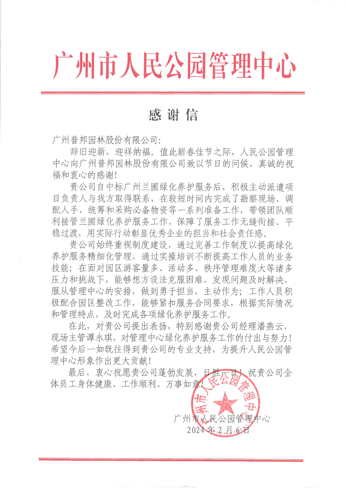 感謝信既是勉勵,也是鞭策。未來,我司將一如既往發(fā)揮專業(yè)優(yōu)勢,持續(xù)提升服務水平,與廣州市人民公園管理中心攜手為廣州市綠化提升作出更大貢獻!